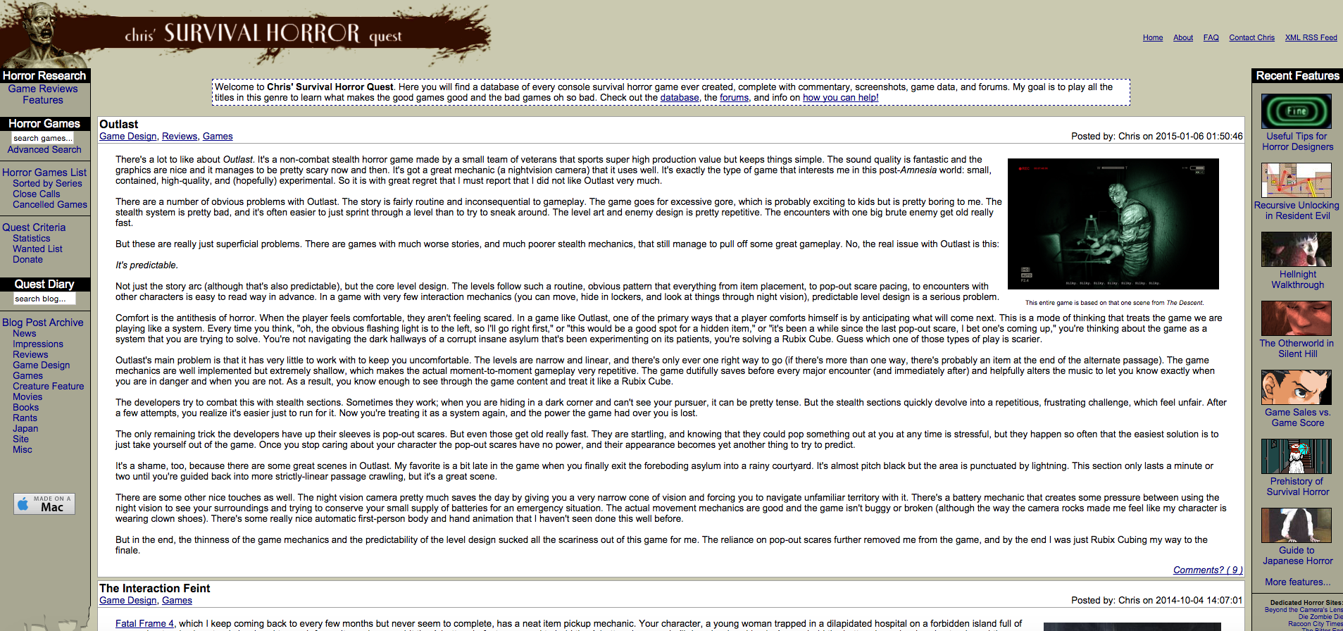 I really enjoy how in depth he gets in his game reviews and features on game design. As someone who is in the industry, Chris brings an expert’s insight into his blogs. He also manages to expand his coverage past talking about the game itself bringing in horror movies and pop culture into his stuff, but always manages to bring it back to the subject that brought us to his website in the first place.