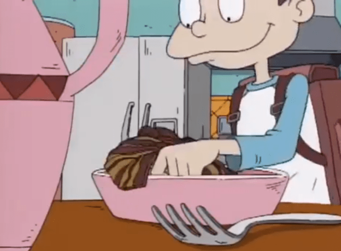 This clip comes from the pilot episode of All Grown Up, a spin off from Nickelodeon’s Rugrats where the characters are older. It’s also an indictment of the show’s once-bald, diaper-wearing protagonist, Tommy Pickles.