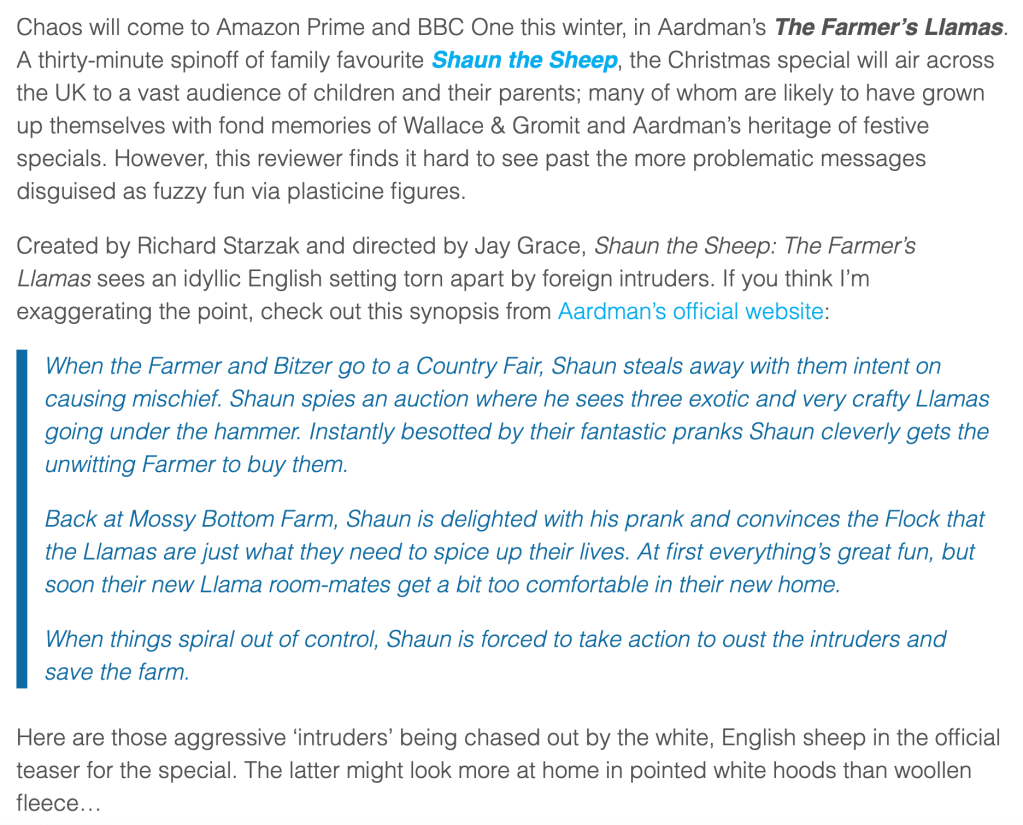 In this deleted article from 2015, a UK writer points out that Shaun the Sheep: The Farmer’s Llamas has a strong anti-immigrant undertones unbecoming of a kid’s show with a worldwide reach, and I couldn’t agree more.