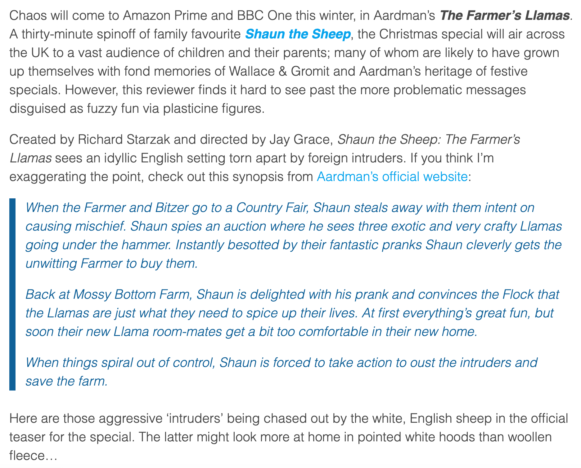 “Burton and Cox are alarmed when I tell them that two bloggers have argued that The Farmer’s Llamas was xenophobic and possibly racist.” https://www.thetimes.co.uk/article/nick-park-on-shaun-the-sheep-the-flight-before-christmas-bbc-mshb97tnr