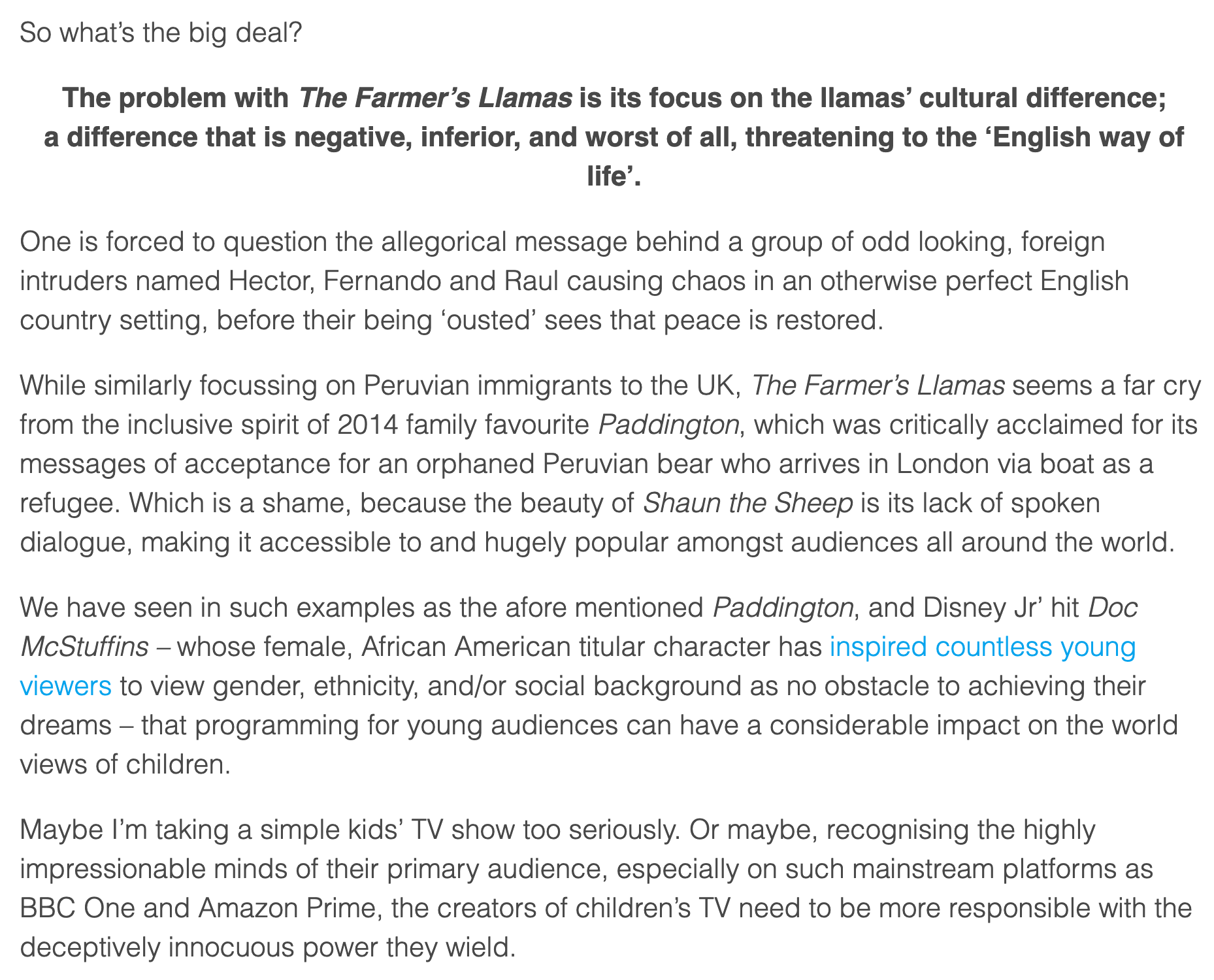 Well, as much as I love majority of Aardman’s works, but unfortunately I have to agree with you about Shaun the Sheep: The Farmer’s Llamas to be racist.